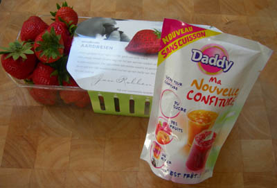 Tijdens zo’n hoosbui vond ik het nodig om mijn voorraadkast eens uit te mesten en ineens kwam ik een zakje jamsuiker tegen uit Frankrijk. Om supersnel jam mee te maken, zonder koken. 200 gram aardbeien pureren met de inhoud van dit zakje (ook 200 gram) en dan in een potje doen. Dat was alles. Gelukkig was ik ook in een pureerfase met mijn geleende Philips Robus staafmixer, dus dat kwam mooi uit. In 3 minuten was ik klaar! Het uitzoeken en afwassen van een leuk potje koste nog de meeste tijd.