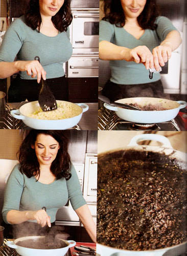 Inktzwarte risotto, heb ik altijd al willen maken. En mijn visboer verkoopt tegenwoordig gewoon zakjes inkt, dus waar wacht ik nog op? Op het recept van Nigella. Het komt uit haar nieuwe boek Keuken waar ik gisteren over schreef. Ze noemt het zelf een ‘prachtig, ietwat somber gerecht, een perfecte maaltijd voor een afspraakje tussen twee gothics’. En als je wilt, mag je de inktvisjes van haar ook weglaten en de boel helemaal zwart laten, maar je zou wel gek zijn.