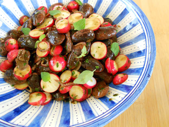 In Oostenrijk at ik Käferbohnensalat steevast met pompoenpitolie en dungeschaafde rettich. Het eerste heb ik tegenwoordig wel in huis, het tweede niet, maar Hollandse radijsjes leken me een waardige vervanger. Dressing van pompoenpitolie dus, plus wat balsamico-azijn, zout, peper. Verder nog een sjalot in dunne ringetjes en wat platte peterselie (oja, en op de foto nog wat rondslingerende blaadjes oregano, puur voor de gezelligheid).