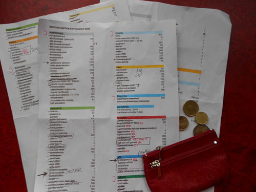 Van niet alle recepten maak ik de volledige hoeveelheid. Soms doe ik een pan of schaal vol, maar voor de broodnodige variatie soms ook maar één enkel bordje (lees: ¼ portie). Da’s dus een heel getel en gepuzzel. Als je alle loslopende ‘klontjes boter’ optelt kom je namelijk moeiteloos aan een kilo. En alle toefjes peterselie bij elkaar zijn vijf ferme bossen. Bij elkaar kom je zo moeiteloos op 3 A4-tjes boodschappenlijst.