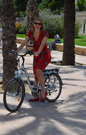 Nu ik toch bezig ben met praktische tips over Valencia, ik zei het al eerder, huur een fiets. En nu niet lachen, maar probeer eens een elektrische fiets. Het leek mij ook eerder iets voor ouden-van-dagen dan voor kwieke, geroutineerde stadsfietsers uit Holland, maar in Valencia is het reuze hip. Ik moet toegeven: ik was na één minuut verkocht. Het lijkt net of iemand je af en toe een lekker duwtje in de rug geeft, reuze prettig. Misschien niet zo nodig in de nauwe, drukke straatjes van het centrum, maar wel zoevend door die geweldige parkachtige rivierbedding die dwars door de hele stad loopt.