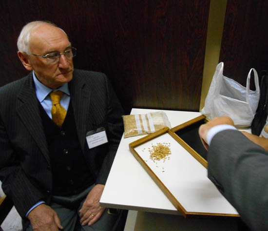 Nog even een stukje risotto-educatie in deze serie, dan doen we morgen weer een recept. Rijst wordt in noord-Italië nog altijd ouderwets verhandeld op een soort rijstveiling of beter gezegd rijstbeurs, de Borsa del riso. Elke ochtend wordt hij in een andere plaats gehouden. Ik was er op dinsdag, dan is hij altijd in het plaatsje Vercelli. Boeren, maar vaker tussenpersonen, onderhandelen daar met inkopers van verschillende rijstfabrieken. Kleine firma’s hebben een simpel tafeltje midden in de hal, grotere bedrijven hebben een heus ieniemini-kantoortje aan de zijkant.