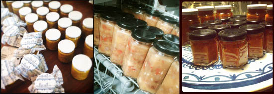 Hier geen industriële pakjes of zakjes, maar wel een arsenaal aan potjes met (uiteraard geheel zelfgemaakte) chutney, sambal, pilipili, piccalilly, mosterd, ingemaakte moestuingroenten, appel- en pepergelei.