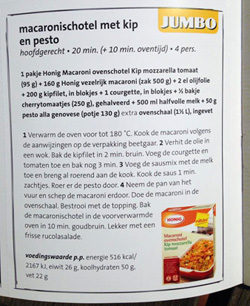 Lezerspost: “Beste Karin, in de ‘Hallo Jumbo’ staan leuke recepten, soms ook op een receptkaart. Leuk om te bewaren, zou je denken. Helaas allemaal recepten met pakjes en zakjes. Voor mij spande de macaronischotel met kip en pesto de kroon. Er gaat zowel kip in als pesto uit een potje en een pakje ‘Honig Macaroni ovenschotel kip mozzarella tomaat’. Ik denk dat jij daar een heel mooi vers alternatief voor kunt verzinnen. Wellicht een idee voor een nieuwe column?”