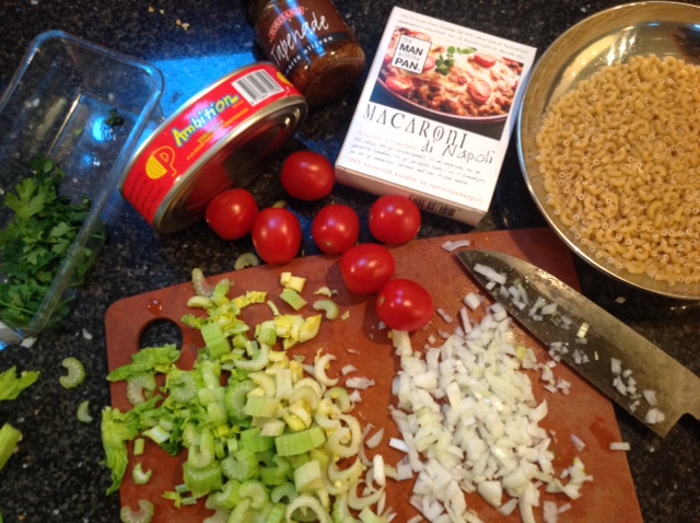 Ik had nog een zakje met specerijen voor iets dat ‘Macaroni di Napoli’ moest worden. Macaroni had ik ook nog. De vereiste gehakt en tomatenpassata waren niet in huis, maar wél een blik sardientjes in tomatensaus en nog wat losse verse tomaten. Een ui heb ik altijd wel en er slingerden ook nog wat treurige bleekselderijstengels rond en een verlept toefje peterselie, dat moest ook maar eens op. Voorts staat mijn huis om onduidelijke redenen vol aangewaaide potjes tapenade, kon daar ook niet wat mee?