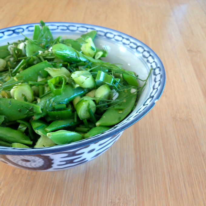 Probeer het eens zo: blancheer sugarsnaps 1-2 minuten in kokend water met wat zout. Snij intussen 2 lenteuitjes in fijne ringetjes (ook het groen), hak wat dille en bieslook fijn (het mogen ook andere groene kruiden zijn, maar deze had ik toevallig in huis), rasp wat citroenschil boven de kruiden op de snijplank. Giet de boontjes af, hussel meteen de hele gehakte/geraspte boel erdoor. Tenslotte nog een ferme kneep citroensap en voor de lekker en de bling-bling een klontje boter.
