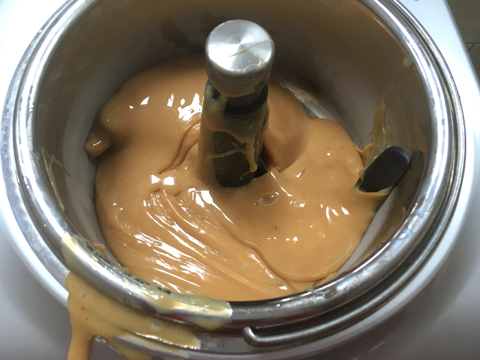 Er waren volgens het recept twee pakjes gecondenseerde melk nodig à 410 ml. Oei, ik ken het spul alleen in blikjes, maar wel ongeveer van hetzelfde gewicht, dus dat moest goed komen. De dikke, lichtgele melk moest worden verwarmd met maïzena om de boel in te dikken. Waarom, geen idee. Dat hoeft toch niet bij ijs? Het spul gaat er toch juist vloeibaar in om er op miraculeuze wijze in ijsvorm weer uit te komen? Nadeel: de pan brandt razendsnel aan, dus zwarte klonten in de melk die er weer uitgevist moesten worden.