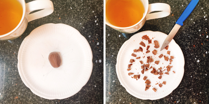 Chocola kan best. Ook bonbonnetjes, ook paaseitjes. Als het maar in kleine stukjes snijdt. Melk sabbelt wat makkelijker (lees: lost sneller op in je mond) dan puur, maar da’s een kwestie van keuze.