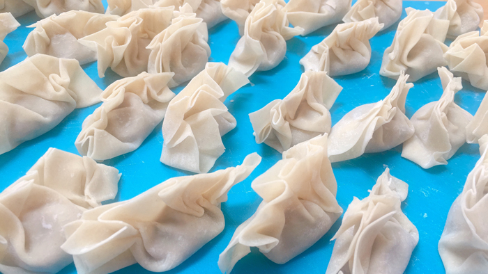 Ik snelde vlak voor sluitingstijd nog even naar de slager voor varkensgehakt. Dat had hij niet paraat en de gehaktmolen was al schoongemaakt, dus dan maar half-om-half, wat gelukkig ook heel goed bleek te werken. De vulling was zó gepiept en al snel zaten we gezellig aan de keukentafel te fröbelen en te knutselen. Met zelfgemaakt deeg in ronde plakjes krijg je bij het vouwen vanzelf mooie gevulde halvemaantjes. Wontondeeg is echter vierkant, dus dan hou je ineens op de gekste plekken stukjes deeg over, maar hee, lang leve de keukenschaar om de boel een beetje te fatsoeneren. Of niet. Zeg dit nooit tegen een Japanner, maar het maakt in feite niet uit als ze er rommelig uitzien, lekker worden ze toch wel.