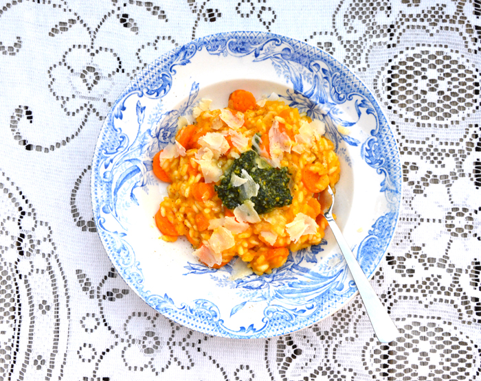 Ik kocht een bos peentjes bij mijn eigen groenteboer en maakte er deze vrolijke wortelrisotto mee. Het loof gooide ik niet weg, dat mocht in de pesto. En er ging ook nog een wuft vleugje sinaasappelrasp door, maar dat zal Anjet me hopelijk vergeven.