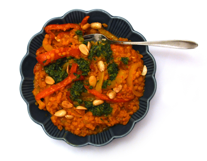 Ach, wat zou ik me ook druk maken. Laten we wel wezen: dit is natuurlijk geen onzinnige poedermix, en alle beetjes helpen om de groenteconsumptie hier te lande te stimuleren, nietwaar? Zelf had ik zin in iets vullenders. Het werd een simpele groentestoof, gezond comfort food voor met een lepel. Er gaan verse paprika’s in en van die vrolijke rode linzen die helemaal vanzelf uit elkaar vallen. Met een knappertje (noten) en een zuurtje (salsa verde) erop heeft u een puik maaltje waar ze bij de diepvriesgigant alleen maar van kunnen dromen.