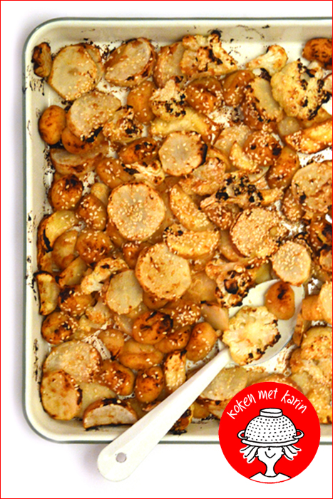 Verwarm de oven voor op 200 °C. De topinamboer (aardpeer) moet u schillen, de pastinaak, meiknol en bloemkool niet. Snij alles in handzame plakjes/stukjes/roosjes. Doe samen met de gnocchi in een grote kom. Doe alle ingrediënten voor de misosaus in een steelpan en verwarm al roerend met een garde tot een gladde, dikke saus. Hussel grondig door de groente met gnocchi. Zout is niet nodig, de miso is al zout. Doe alles op een grote, met bakpapier beklede bakplaat of zelfs twee, en zorg dat de boel niet te veel op een kluitje ligt. Bestrooi met sesamzaad. Rooster in het midden van de oven gaar en bruin, met hier en daar een mooi donker randje. Reken op ± 25 minuten, maar hou het in de gaten. Elke oven is anders en het formaat en de versheid van de groente maken ook dat het elke keer anders uitpakt.