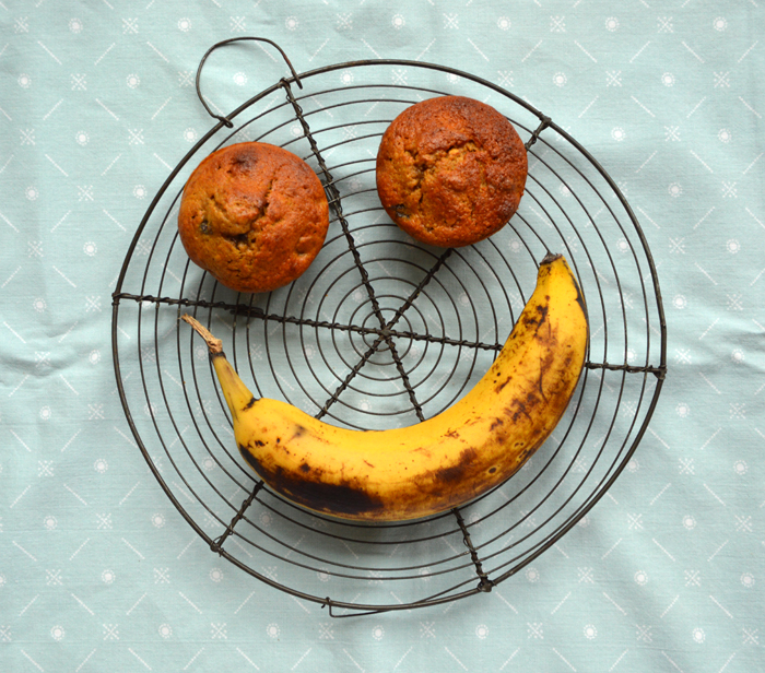 Weer eens iets anders dan bananenbrood, deze luxe miniversie: banenenbroodmuffins. Ideaal vehikel voor treurige overrijpe bananen die niemand meer lust.
