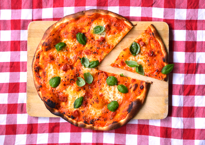 Waar ik me echter het meest over verbaasde is het allervaakst thuisbezorgde gerecht van heel Nederland: pizza margherita. Met alleen tomatensaus, mozzarella en basilicum de meest basic pizza die er is. Puik idee bij een topadresje in Napels, alleen zou je denken dat de gemiddelde Nederlander ‘m liever zo vol mogelijk heeft, tot ananas aan toe. Maar goed, margherita is wel de goedkoopste natuurlijk. Zelf maken dan maar? Pizzadeeg is heus niet moeilijk – bloem, water, gist en zout – maar bij ons thuis maken we ook vaak deze luie sjoemelversie met spullen uit de voorraad, zodat er niemand in weer en wind op pad hoeft.