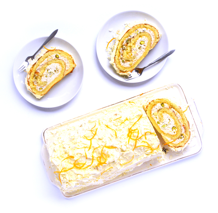 Nagerecht: Witte kerst (cakerol gevuld met slagroom, witte chocola, sinaasappel en pistache)