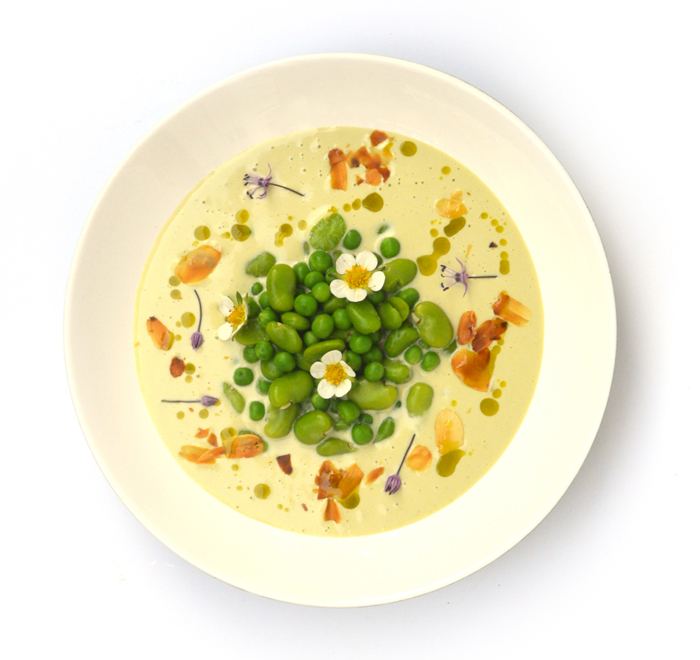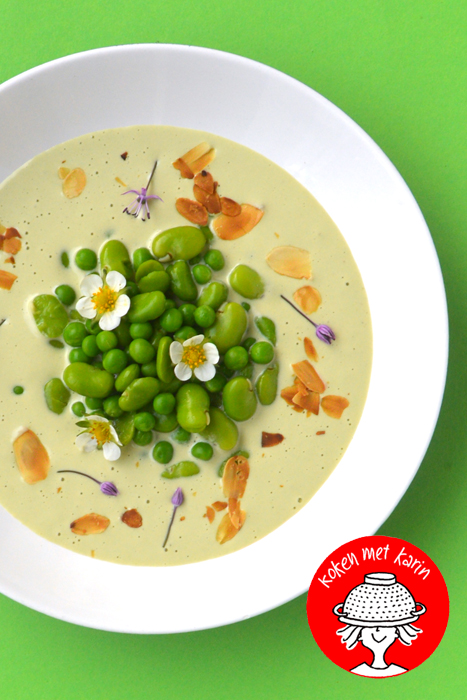 Serveren: Giet de soep in borden. Schep de doperwten en tuinboontjes in het midden. Garneer met amandelschaafsel, eetbare bloemetjes en een sliertje olijfolie.