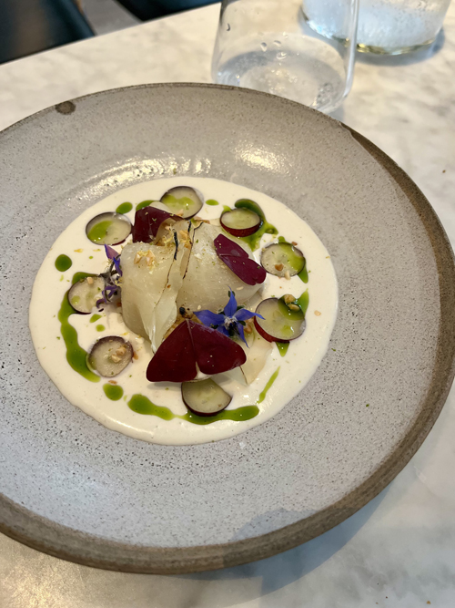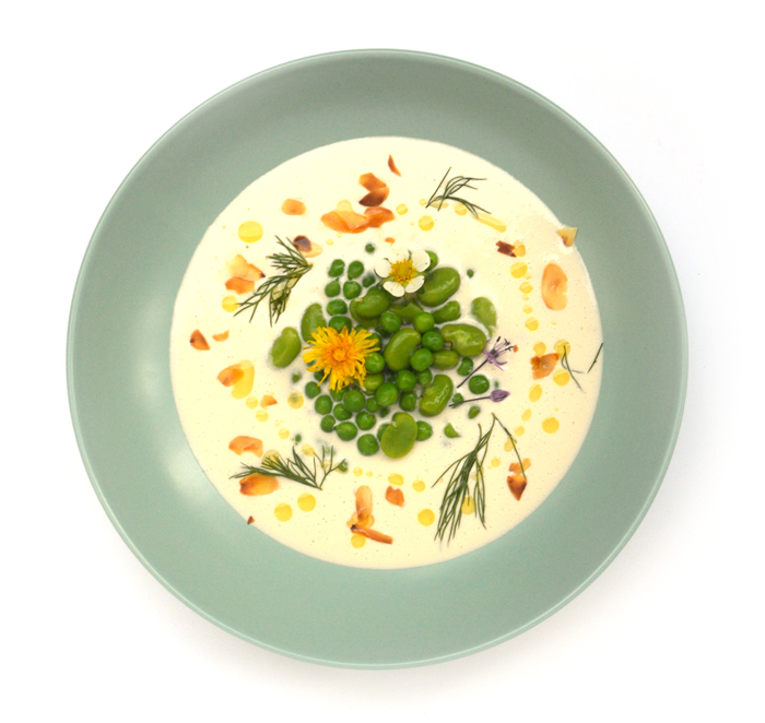 Bij restaurant Harvest roomwit als een Spaanse ajo blanco, op basis van amandelen. Allebei sierlijk gegarneerd met een bergje seizoensgroente en eetbare bloemetjes. Dat ging ik thuis ook meteen proberen na te maken. Daslook is er intussen natuurlijk niet meer, maar maggikruid bleek een heerlijk alternatief. Heb je dat niet, laat het dan gewoon weg. Verse boontjes had ik ook al niet, maar met die uit de diepvries bleek het ook uitstekend te gaan. Het resultaat is een heerlijk simpel en toch deftig ogend voorgerecht.
