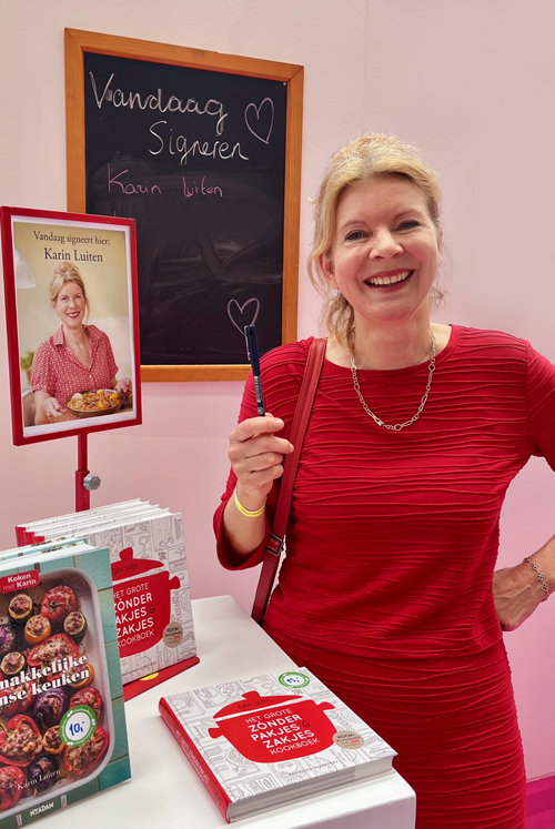 Ik neem van alles wat mee, maar op is natuurlijk wel op: het gloednieuwe bakboek: De zoete oven, het reislustige Wereldgerechten, de grote klassieker Het grote zonder pakjes & zakjes kookboek, de verrassend groene Vega zónder pakjes & zakjes, het ohlala francofiele De makkelijke Franse keuken, het leuke doe-het-zelfboek-voor-jong-en-oud Van Moestuin tot Maaltijd en het beslist niet kinderachtige Grote kinderkookboek zónder pakjes & zakjes (inclusief kinderkookschort!). En zoals gezegd: iedereen die die middag een boek van mij koopt, krijgt een unieke Koken met Karin-spatel cadeau.
