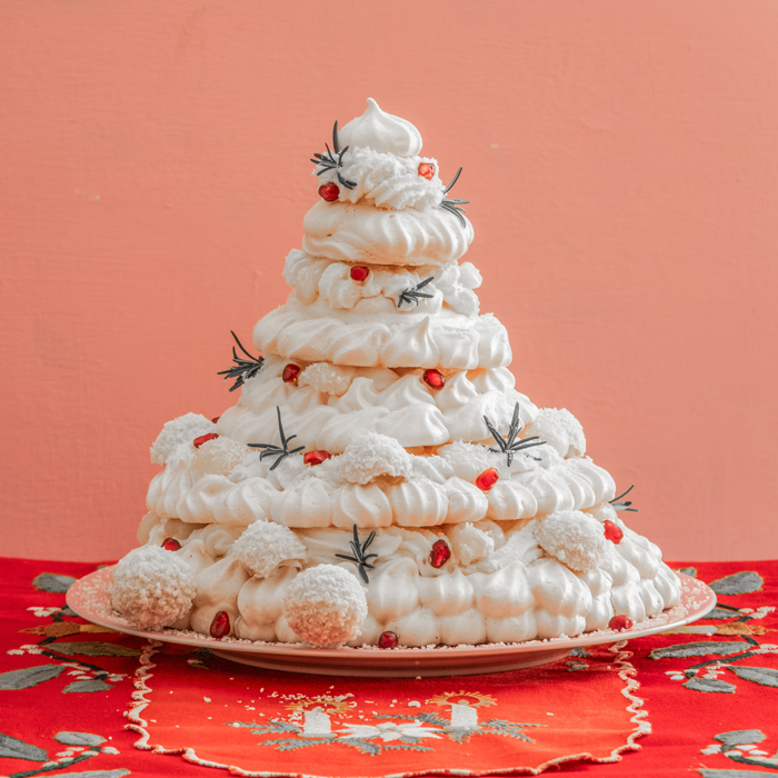 Dreaming of a white Christmas? Dream on… Maar deze sneeuwwitte kerstboompavlova zorgt binnenshuis volop voor oh’s en ah’s. Hij komt uit mijn nieuwe bakboek De zoete oven, maar speciaal voor de kerst mag het recept nu ook online. Het is een beetje gefröbel met de verschillende formaten om een mooie toren te krijgen, maar heus, daar kom je wel uit. En dan is hij in al zijn eenvoud ronduit spectaculair om te serveren als afsluiting van je kerstmenu. Met toefjes rozemarijn erin – o dennenboom! – ter verhoging van de feestvreugde, plus vrolijk rode granaatappelpitjes. Kokosrasp zorgt voor sneeuw.