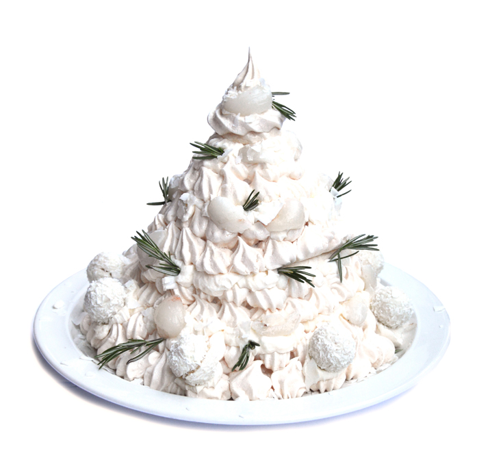 Garneer de buitenkant met lychees, sneeuwballen in de vorm van Raffaello’s, toefjes rozemarijn en granaatappelpitjes. Bestrooi met kokosrasp bij wijze van sneeuw.