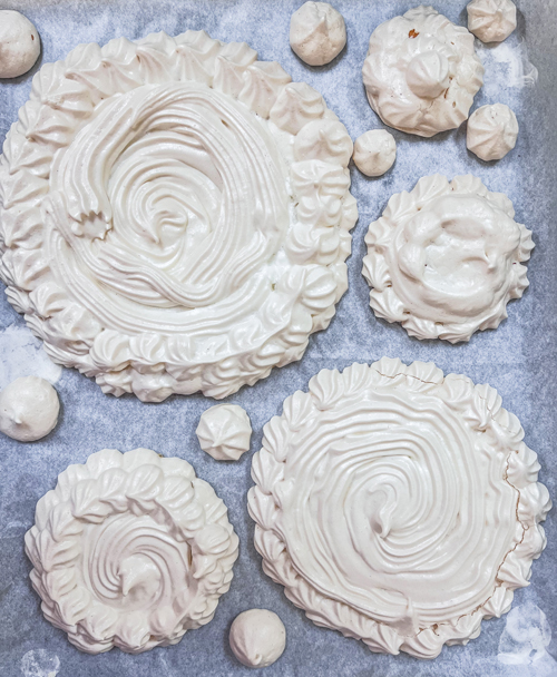 · Je kunt de meringues heel goed van tevoren bakken. Bewaar ze losjes maar goed ingepakt met alufolie of in trommels met een velletje papier ertussen, tegen het beschadigen. Niet in de koelkast!