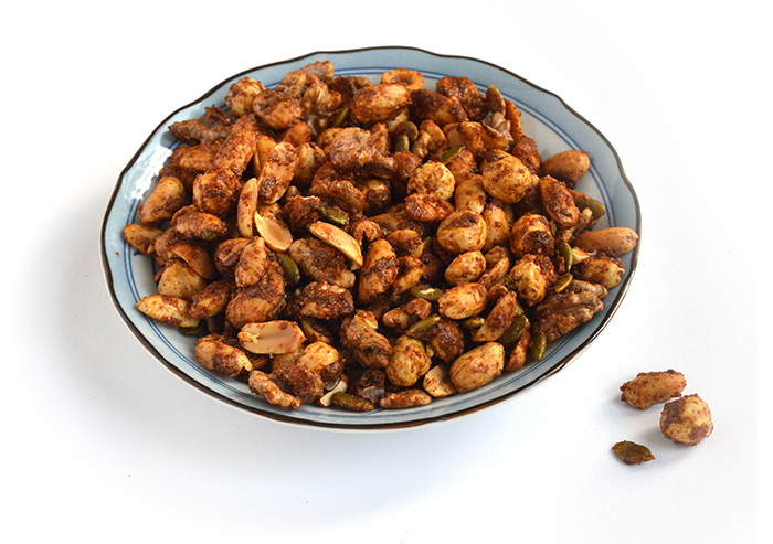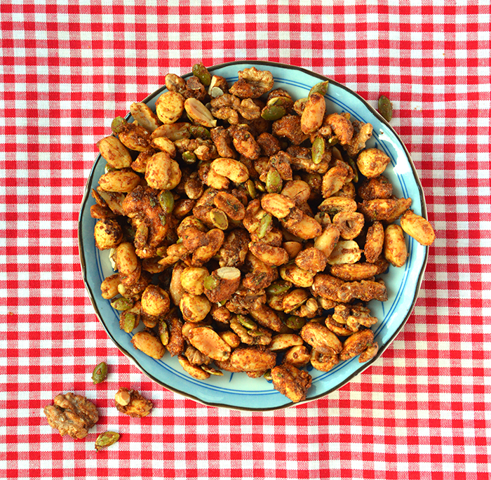 Verbazingwekkend hoe noten opknappen van een verblijf in de oven. Ik was nooit zo’n fan van knoflookpoeder en uienpoeder (wat is er mis met een gewone knoflookteen en een ui?), maar in dit geval heeft het echt nut, want het geeft veel smaak zonder kans op verbranden. Het geheim van dat unieke bros-krokante jasje zit ‘m in de toevoeging van eiwit, maar ook suiker. Dan is er als tegenhanger van dat zoet wel echt wat pit nodig. Heeft u geen pittige pimentón? Neem dan mild (wel gerookt!) paprikapoeder plus een ferme snuf cayennepeper.