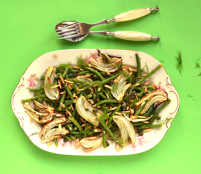 Ben je geen groot groente-eter of heb je (huisgenoten met) moeite met de aanbevolen dagelijkse dosis? Dan heb ik de oplossing: gun groente een verblijf in de oven. Venkel bijvoorbeeld, die knapt daar enorm van op. Probeer het eens, in deze lekkere salade van venkel met sperziebonen. (En ja, die laatste kunnen ook uit de oven, maar dat doen we hier nou juist lekker níet!)