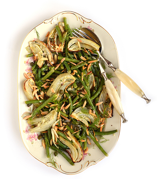 Serveren: Parkeer de venkel en sperziebonen in een grote schaal. Strooi de amandelen en het venkelgroen erover. Eet lauwwarm of op kamertemperatuur.