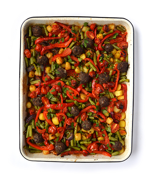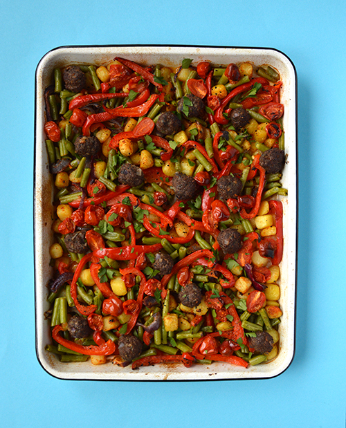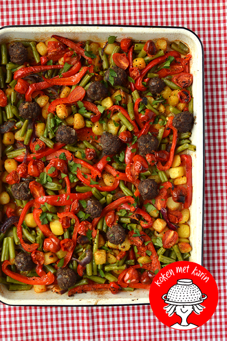 Grappig genoeg moet de poedermix volgens de instructies alleen door de groente; met het gehakt gebeurt helemaal niks. Dat dient u zonder enige smaakmaker tot balletjes te draaien. Zullen we het dus maar weer lekker even helemaal zelf doen? Want een bakplaatmaaltijd is natuurlijk zo in elkaar geflanst, zo’n pakje levert u welgeteld nul tijdwinst op. U heeft vast nog wel wat specerijen in uw keukenkastje staan. En dan doen we meteen wat extra groente erdoor, paprika. Plus diepvriesboontjes, die hoeft u namelijk niet voor te koken. Nóg makkelijker.