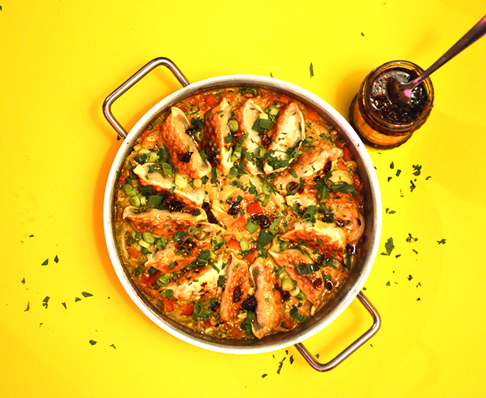 Alleen vonden wij thuis het resultaat hooguit mwah. De onweerstaanbare aantrekkingskracht van gyoza is volgens mij nu juist dat je ze eerst in wat olie aan één zijde knapperig goudbruin bakt, en ze daarna met een scheutje water onder een deksel verder gaar stoomt. Maar in de gehypte ovenversie is er niks knapperig aan, bij mij waren het althans zompige pasta-achtige gevalletjes in een enorme sloot saus. Zelfs een dubbele dosis van hippe crispy chili olie kon de boel niet meer redden. Terwijl op zich het idee van gyoza’s in saus in de oven natuurlijk best leuk is. En avondmaaltijdwaardig. Maar dan zou ik het toch anders aanpakken. Deze aangepaste versie bleek bij mij thuis wél een groot succes. Zo blijkt maar weer: vertrouw nooit op internet en volg liever je eigen koers.