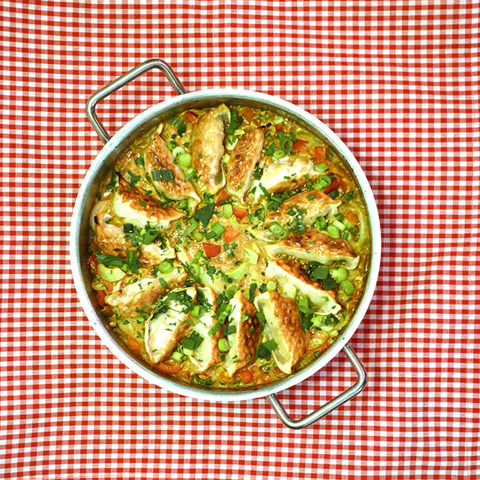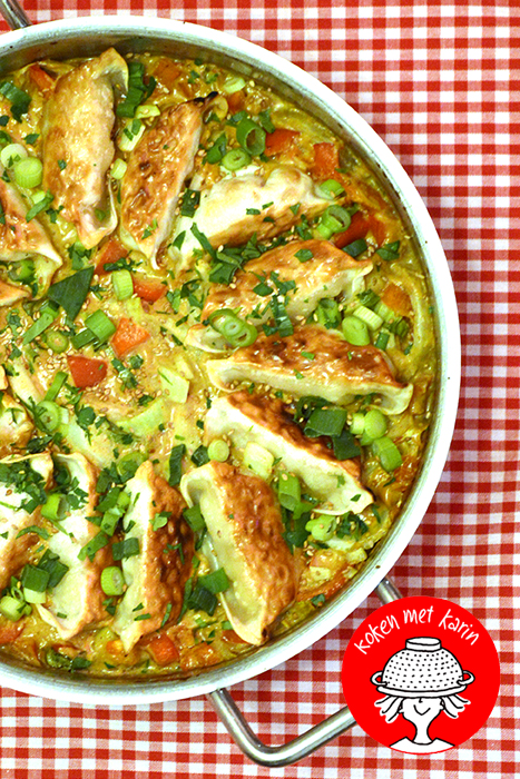 Daarentegen hebben de kaboutertjes van instagram intussen feilloos in de gaten dat ik bezig ben met een nieuw groentekookboek, want ik kreeg de afgelopen tijd alleen maar ongevraagde filmpjes voorgeschoteld van mij onbekende koks die iets doen met groente. Tussendoor kwam ook een filmpje voorbij van ‘gyoza bake’. Een hype die mij tot dan toe ontgaan was. Nu ben ik toevallig dol op gyoza’s. U weet wel, die Japanse dumplings in de vorm van een halvemaanvormige deegcocon met een sierlijke ruche. Uiteraard heb ik ook een zelfmaakrecept, het staat hier op deze website en anders in mijn boek Wereldgerechten, maar elke supermarkt heeft ze tegenwoordig in de diepvries. In dit viral recept gaan ze bevroren en al in een ovenschaal, voorzien van een blik kokosmelk plus wat oosterse smaakmakers. Een half uurtje later zie je een gelukzalig smullende maker. Dat wilde ik ook wel eens uitproberen.